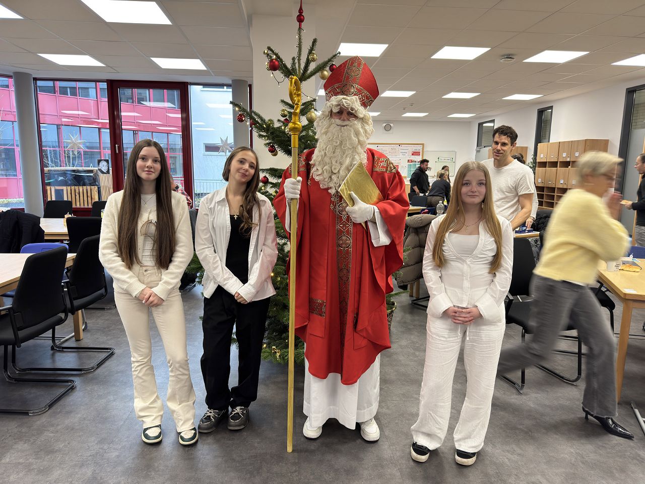 Der Nikolaus stattete allen in der Schule einen Besuch ab. Die Klassen und das Lehrerkollegium präsentierten Lieder und Gedichte, dafür erhielten sie ein kleines Geschenk vom Nikolaus. Für die Grundschüler ist dieser Tag ein besonderes Erlebnis. In der Aula wurde der Nikolaus von allen Grundschulklassen mit einem musikalischen Beitrag empfangen.