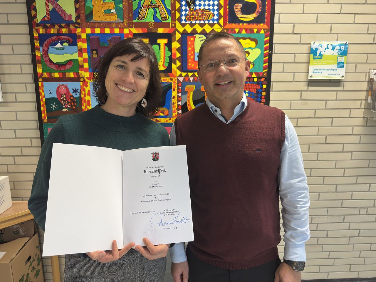 Nachdem sie das Amt bereits kommissarisch ausübte, konnte Frau Dr. Maria Schlitt nun ihre offizielle Ernennungsurkunde zur Konrektorin als Pädagogische Koordinatorin aus den Händen von Schulleiter Mario Merkes entgegennehmen.