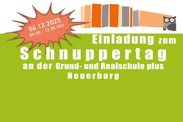 Die Grund- und Realschule plus Neuerburg lädt die Schülerinnen und Schüler der vierten Klassen und ihre Eltern zum diesjährigen Schnuppertag am Samstag, den 06. Dezember 2025, von 09.00 Uhr bis 12.30 Uhr nach Neuerburg ein.