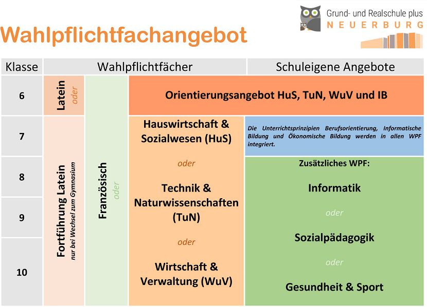 Die Wahlpflichtfächer bilden den Kernbereich der Realschule plus. Die Schülerinnen und Schüler können bereits im 6. Schuljahr statt einer zweiten Fremdsprache, Französisch oder Latein, das Orientierungsangebot durchlaufen. Innerhalb eines Schuljahres bekommen die Kinder Einblicke in die Fächer HuS, TuN und WuV und wählen vor den Sommerferien, welches dieser Fächer sie künftig beibehalten möchten. Ergänzend wird zu dem Orientierungsangebot das Fach IB unterrichtet, um den Schülerinnen und Schülern einige Grundlagen der Informatischen Bildung an die Hand zu geben.